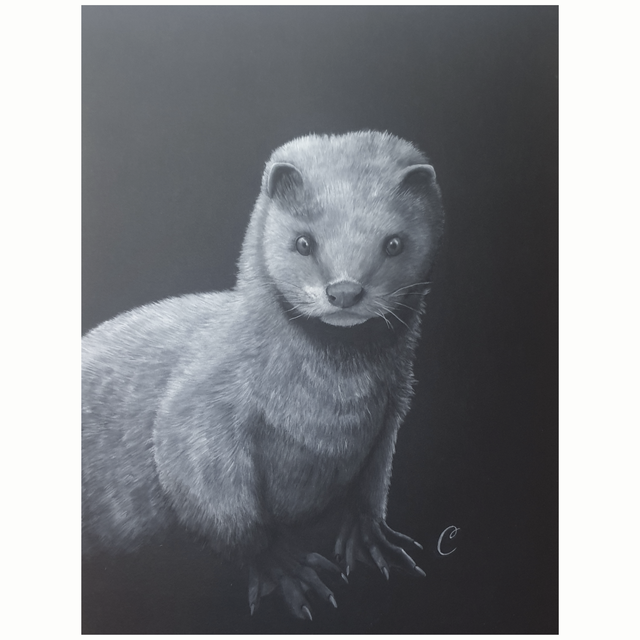 Cette aquarelle explore la présence silencieuse du vison d'Europe, dont la mignonnerie nous touche immédiatement .